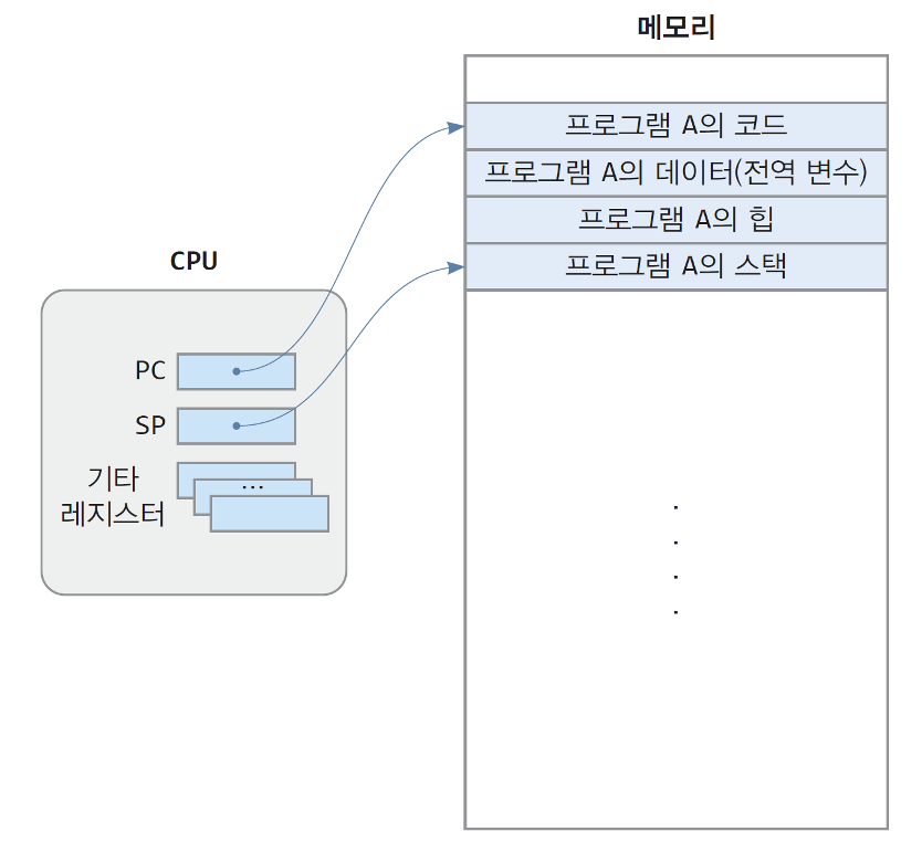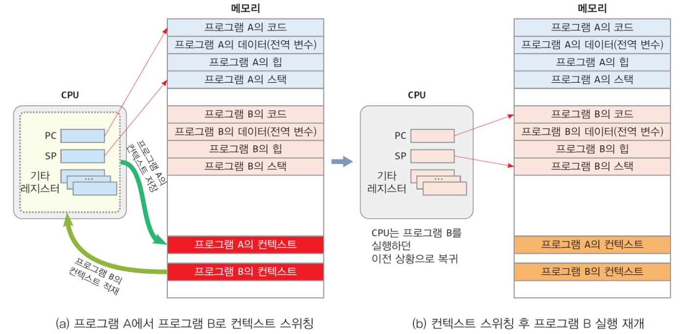 - 프로그램 B의 저장된 컨텍스트 정보를 CPU에 적재한다. 이때부터 CPU의 PC레지스터는 프로그램 B가 실행을 재개할 코드의 주소를 가리키게 되고, SP레지스터 역시 프로그램 B의 스택 영역을 가르키게 된다.